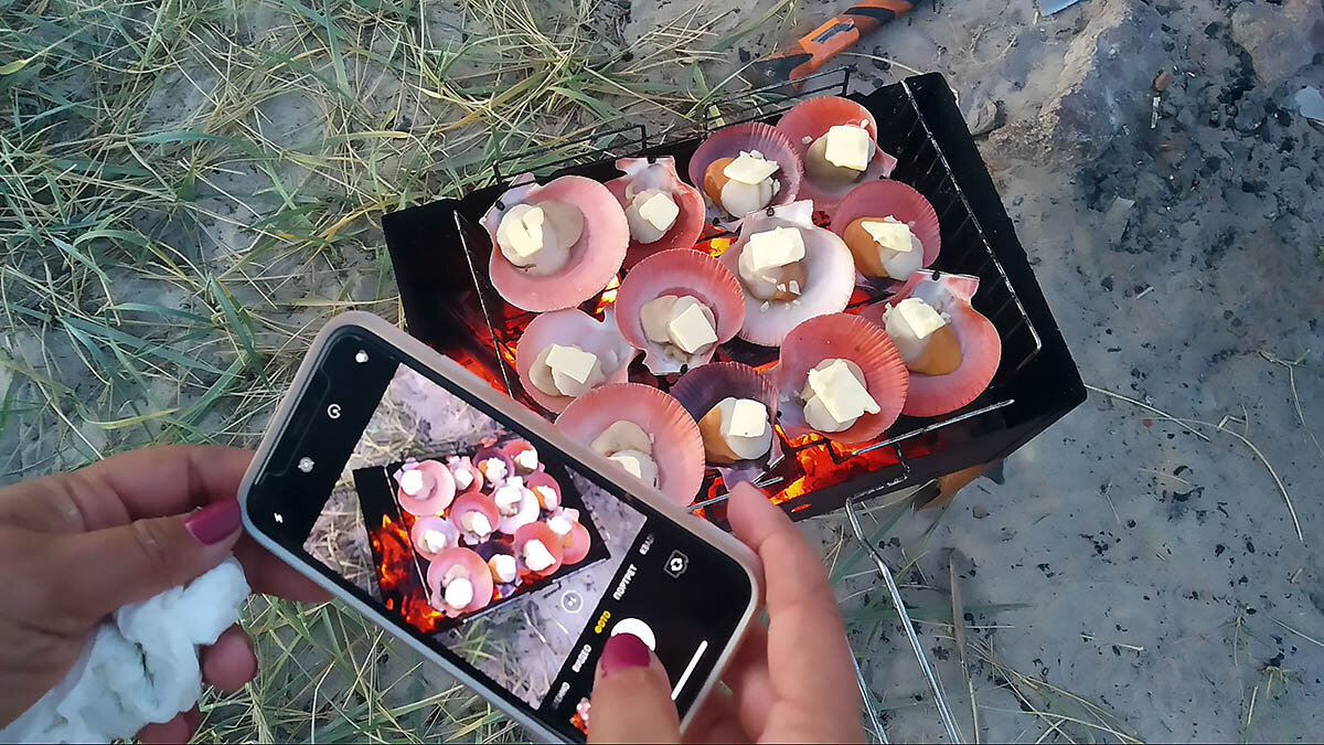 Еще и ночуем с друзьями в палатке, и готовим на костре. И связи - никакой, даже нагуглить варианты использования мороженых гребешков нет никакой возможности.
