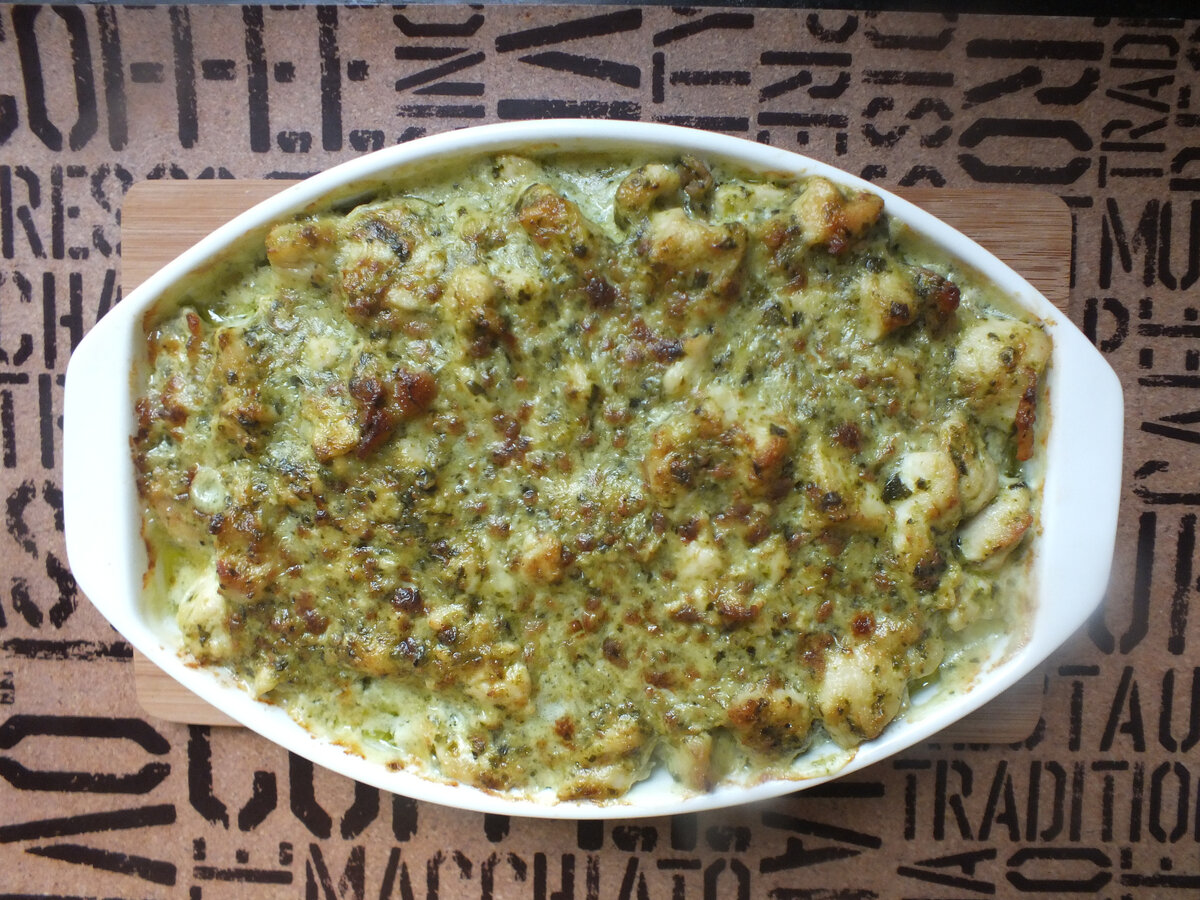 Сверху цветной капусты выложим смесь из курицы, бекона, шпината и сливок.