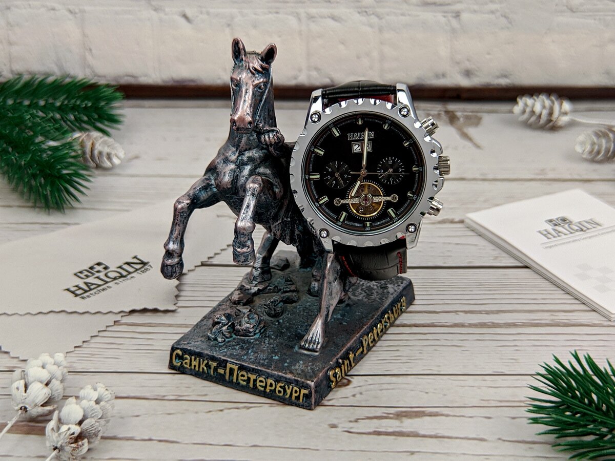 Корпус часов изготовлен из сплава металла с глянцевым покрытием, в моем случае это хром. По бокам корпуса имеется всего 3 кнопки управления и заводная головка. На основном циферблате имеется 2 дополнительных циферблата левый является индикатором дней недели, а правый месяцев. Вверху же расположен счётчик даты. Дата настраивается верхней, правой кнопкой. Нижняя кнопка переводит месяц. Однако настройка дней недели производится левой, скрытой кнопкой. В этом комплекте скрепка для нажатия на эту кнопку отсутствует. Вместо цифр на циферблат нанесены декоративные риски на которые, как и на стрелки нанесено люминесцентное покрытие накапливающее свет, за счёт чего время видно и в полной темноте. Правда запас небольшой, но все же.