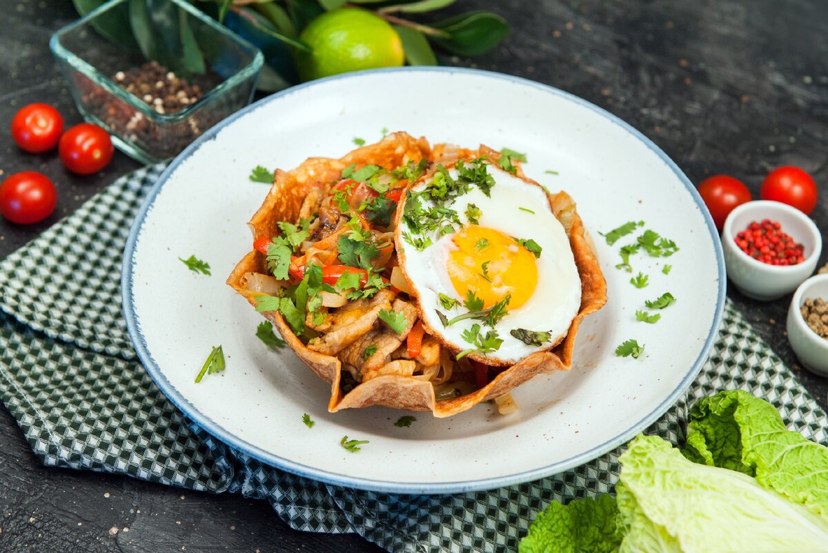 11. Подаем лапшу в блинной корзиночке, сверху выкладываем яйцо, посыпаем кинзой. Приятного аппетита!