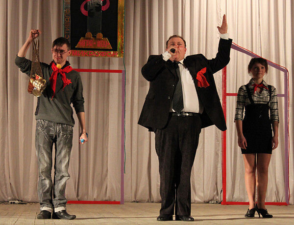 Участникам повязывают пионерские галстуки и выдаются гудки-горны.