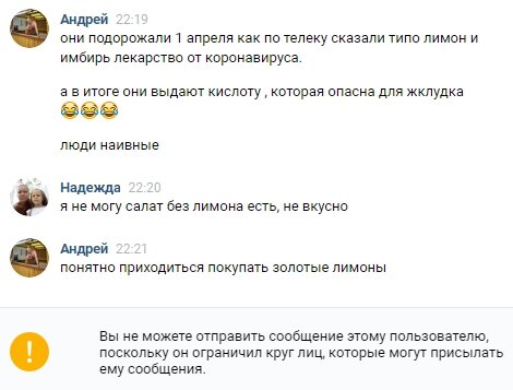 Пишу ему вечером в ВК, жалуюсь что купила лимоны по 600 рублей за кг, (был самый разгар "пандемии") - Ответ был такой