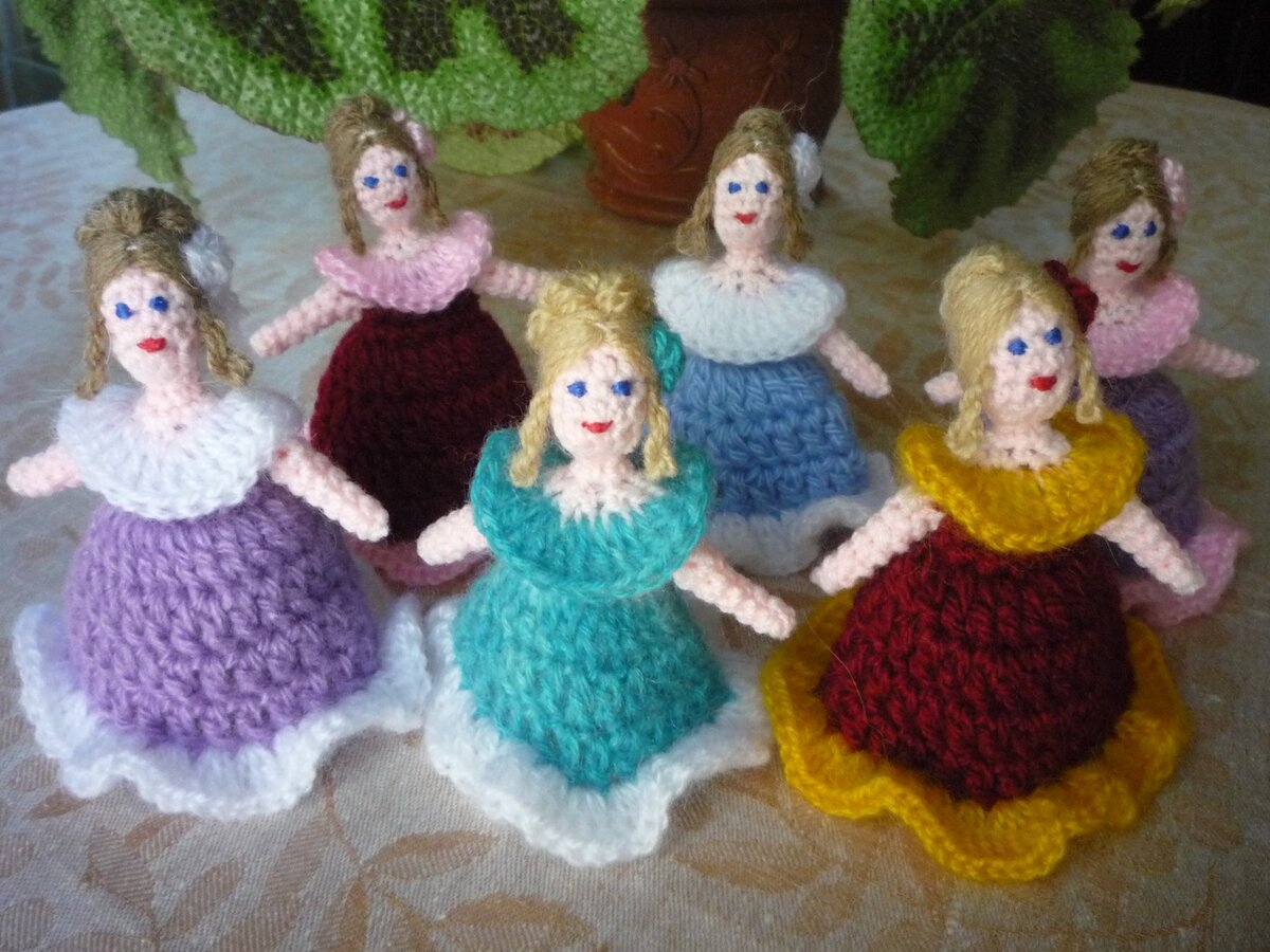 Вот я и придумала вязать кукол - "барышни" пушкинского времени. Идею и схему вязания разработала сама. Куклы небольшого размера - 7-8 см. в высоту. Вязала их как куклу на палец. Они предназначены для разыгрывания спектаклей. Развивают мелкую моторику рук ребенка.