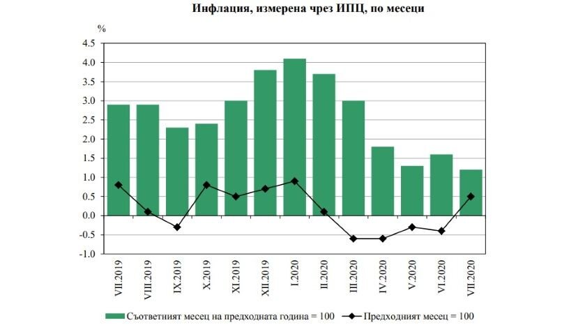 Месячная инфляция в июле этого года в Болгарии составила 0.5%, а с начала года – минус 0.5%, показывают данные Национального института статистики. Годовая инфляция в июле 2020 года по сравнению с июлем 2019 года составила 1.2%... В июле годовая инфляция в Болгарии составила 1.2%