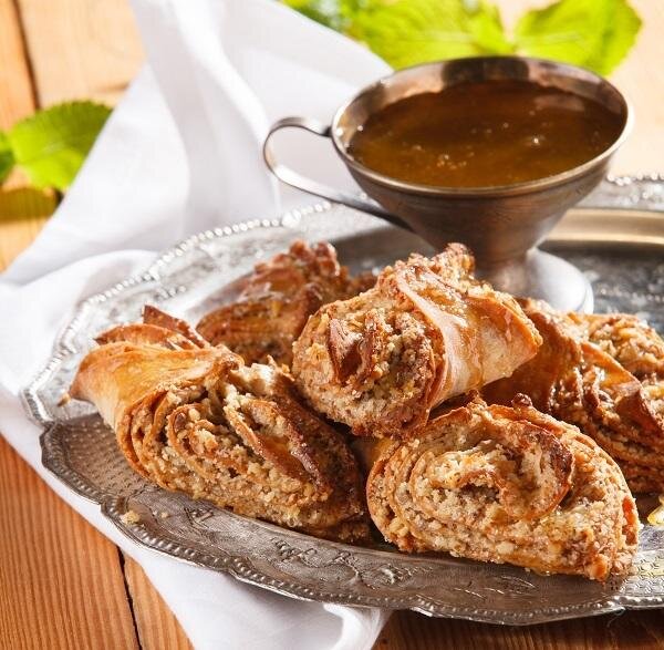 - Растопить масло и обильно смазать им тесто, затем посыпать 1/6 частью смеси орехов и сахара. Так же раскатать следующий кусок теста, уложить на первый слой, смазать маслом, посыпать орехами с сахаром. Продолжать, пока не закончатся тесто и начинка.