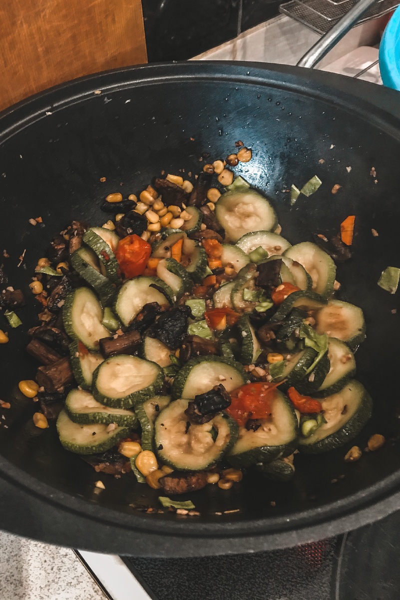 Когда я не знаю , что приготовить , а в холодильнике почти ничего не осталось , на помощь приходят ВОКи. Для этого блюда у меня всегда найдутся продукты и мои домашние любят подобные блюда. Итак, нам понадобятся : Грибы я обжарила с чесноком и добавила к ним все остальные овощи Тушила овощи до готовности и добавила к получившейся смеси соевый соус на глаз ( около 8 столовых ложек ), терияки 1 столовую ложку, шрирачу для остроты и продолжила тушить еду. Пока овощи готовились , отварила необходимое количество рисовой лапши по инструкции с упаковки Как только лапша и овощи были готовы соединила все вместе и протушила ещё около 5 минут. ВАЖНО, после соединения всех ингредиентов должно оставаться достаточно бульона , иначе лапша возьмёт в себя всю влагу. Если готовите не на раз , лучше не соединять лапшу. Такая красота получилась по итогу . Подаю всегда приправив кунжутом.