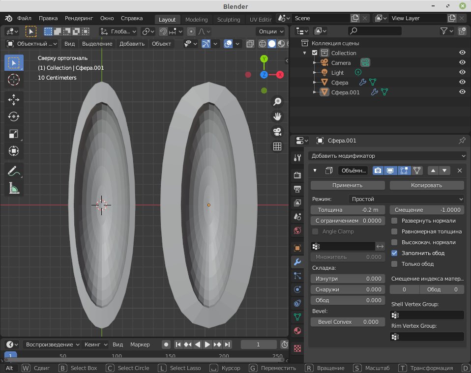 Задача данного модификатора добавить вашему объекту толщину стенок, и он с этим превосходно справится, если делать всё правильно, давайте разбираться. Толщина модификатора рассчитывается, используя локальные координаты вершин. Если объект имеет неравномерный масштаб, толщина будет разной на разных сторонах объекта. Вот простой пример. Возьмем полусферу, с которой и будем сегодня экспериментировать. Сожмем её по оси Z и Х, а затем продублируем. Теперь давайте на одной полусфере мы применим наши изменения с помощью ctrl+A, а на другой не будем этого делать. А теперь добавим модификатор с одинаковыми настройками. Обратите внимание, что там, где мы применили наши трансформации толщина стенок равномерна (справа), а вот на втором мы получили очень некорректное утолщение, поэтому не забывайте применять ваши изменения.