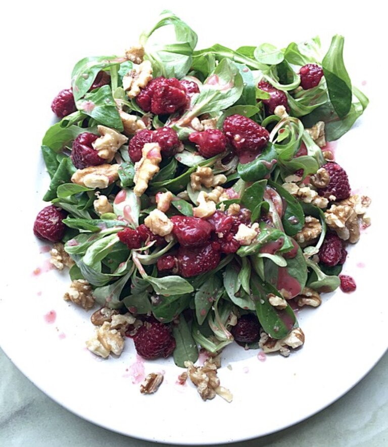 Добрый день, дорогие читатели! Спасибо, что проявили интерес и заглянули на мой канал. Надеюсь, что моя статья окажется для Вас интересной и полезной. Желаю Вам приятного прочтения. Продолжая тему летних легких салатов хочу поделится с Вами рецептом салата с малиной и шпинатом. Вместо малины можно использовать клубнику, ежевику, виноград, арбуз, гранат и любые другие сезонные ягоды и фрукты. Для данного рецепта понадобятся следующие ингредиенты: Для салата: 150 г малины; 100 г сыра фета (моцарелла или другой сыр на Ваш вкус); 150 г листьев шпината (или базилика); 75 г грецких орехов (или кедровых орехов); 1 ст. ложка меда; 3 ст. ложки оливкового масла; 2-3 ст. ложки уксуса (белый бальзамический уксус); 1 ч. ложки дижонской горчицы; соль и перец по вкусу. Приготовление: 1. Для начала подготовим малину и листья шпината (можете взять листья базилика). Моем их под холодной проточной водой, далее аккуратно перекладываем на бумажное полотенце и обсушиваем. Совет: если у Вас нет свежей м