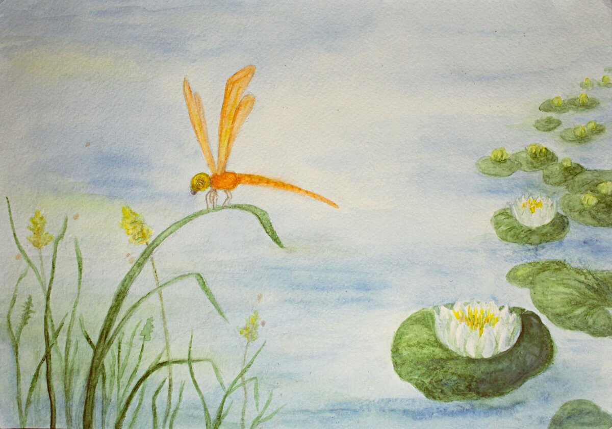 Какое чудесное теплое лето! Придало силы, настроило на творчество. Появились новые фотографии, скетчи, зарисовки с пленеров и даже "картины маслом". А я приглашаю сейчас расписать стекло - небольшую баночку, и превратить ее в интересную вазу, которая тоже напомнит о лете. На этот узор меня вдохновила стрекоза, которая приземлилась на цветок прямо передо мной, и не желала улетать, пока я не сфотографировала ее! (Фото 2). На стекле можно рисовать специальными красками, но они, скорее всего, есть не у всех. А можно использовать и обычную гуашь, смешав ее с клеем ПВА. Благодаря клею, гуашь ложится ровно и не осыпается. Если Вам потом захочется изобразить что-то другое, смыть рисунок довольно легко. Для этой работы Вам понадобятся: - стеклянная банка; - гуашь: красная (или алая, главное теплого цвета, ближе к кирпичному, а не к малиновому), коричневая, синяя (или сине-зеленая, морская волна), желтая, белила; - кисточка небольшого размера; - клей ПВА. Расписывать стекло – это почти вол