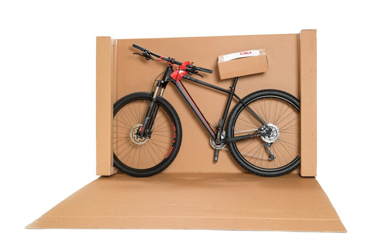 Эта инновационная транспортная упаковка, полностью изготовленная из гофрированного картона, обеспечивает идеальную защиту велосипеда при транспортировке. Велосипед помещается в коробку полностью собранный, только педали отдельно. Колеса закреплены с двух сторон, в торцевых стенках сделаны особые фиксаторы для них. На седло крепится дополнительная коробка в которую также помещены педали.