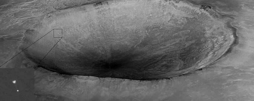 Это уникальное изображение Феникса, спускающегося на парашюте. Здесь показано более широкое изображение полного изображения, показывающее кратер диаметром 10 км, неофициально называемый «Хеймдалль», и улучшенное изображение парашюта и посадочного модуля в полном разрешении. Хотя кажется, что Феникс спускается в кратер, на самом деле он находится примерно в 20 километрах от кратера. Трудно поверить, что он находится перед кратером, потому что он намного меньше, но на самом деле это так, и это хорошо, потому что приземление на крутых скалистых склонах кратера было бы слишком захватывающим (или рискованным). ).