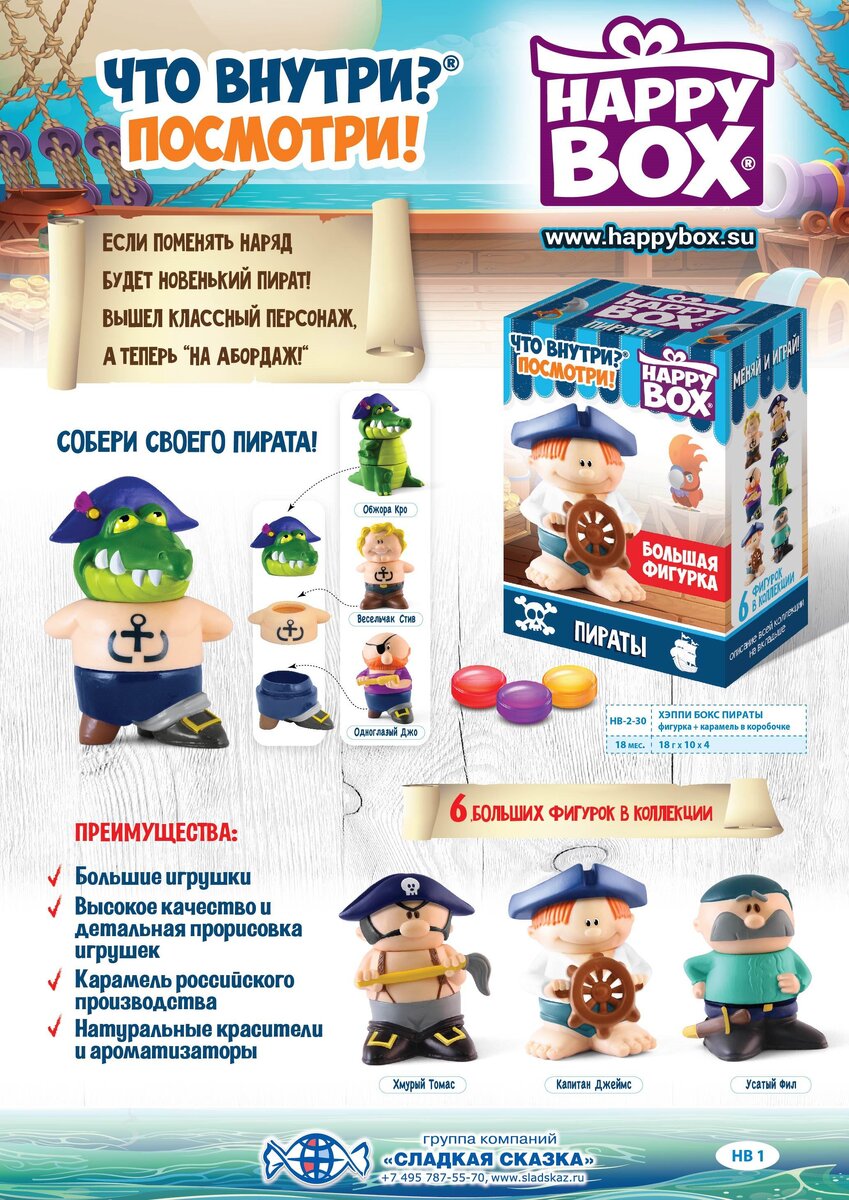 НОВИНКА! КОЛЛЕКЦИОННЫЙ НАБОР HAPPY BOX «ПИРАТЫ» С НЕОБЫЧНЫМИ ИГРУШКАМИ новинка в линейке Happy Box Коллекционный набор «Пираты» с необычными игрушками, которые можно разбирать и собирать, создавая совершенно новые фигурки. В коллекции — 6 больших и ярких фигурок из высококачественного пластика с детальной прорисовкой. Главная особенность игрушек в том, что каждую из них можно разобрать на три части (голова, тело и ноги) и соединить их с деталями от других пиратов из коллекции. Таким образом, можно создать много новых уникальных пиратов и устроить настоящий морской бой больших масштабов. У каждого пирата есть своя кличка, которая в той или иной степени отражает характер героя: Хмурый Томас, Обжора Кро, Одноглазый Джо, Весельчак Стив, Капитан Джеймс и Усатый Фил Помимо пирата в коробочке есть яркий вкладыш с изображением всех игрушек в коллекции