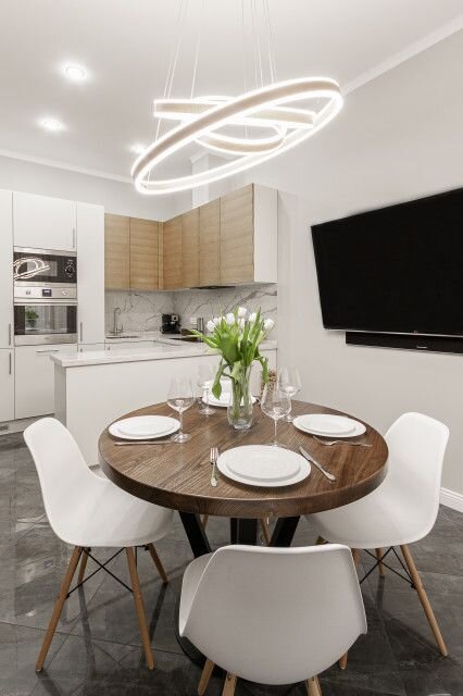 ОБЗОР ПРОЕКТА Строгим, но в то же время очень уютным получился проект для клиентов из Москвы. В этот раз обустраивали двухкомнатную квартиру площадью 80 м2. При первичном обсуждении тура клиенты планировали оформить интерьер в черно-белых тонах. Но уже в процессе покупок планы немного изменились. В гостиную было решено добавить немного коричневого цвета. За время мебельного тура, который составил 6 дней, были приобретены отделочные материалы и мебель для ванной комнаты, напольная плитка для гостиной, кухня, обеденная зона, спальный гарнитур, мягкая мебель, а также вся необходимая сантехника и свет. Особенно хочется отметить люстру над обеденной зоной. Уж очень она нам понравилась. Для придания интерьеру законченного вида были подобраны и приобретены занавески и некоторые элементы декора. Клиенты остались довольны результатом и уже вовсю наслаждаются жизнью в своей обновлённой квартире. Продолжительность тура: 6 дней. Для более подробного ознакомления рекомендуем посетить нашу страницу