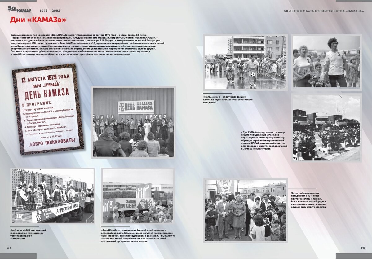 К августу 1979 года «камский батыр» уже выпустил первые 100 тысяч грузовиков. Первый «День КАМАЗа», начавшись в 10 утра в жилых микрорайонах, действительно, длился целый день. Были чествования лучших бригад, встречи с руководителями шефствующих подразделений, ветеранами производства, спортивные состязания. Больше всего внимания было отдано детям, увлекательные мероприятия сменялись одно за другим.