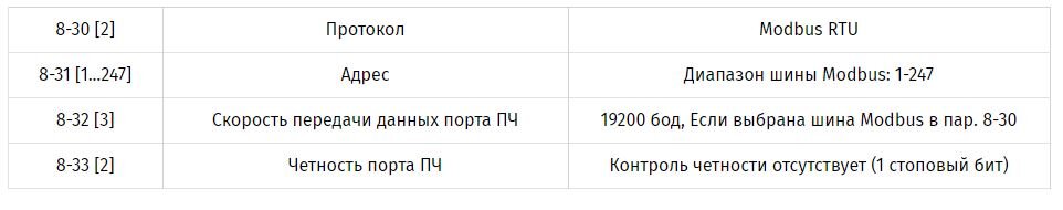 Преобразователи частоты VLT Micro Drive FC 51 Danfoss поддерживают работу по протоколу Modbus. Для реализации управления частотным преобразователем необходимо настроить параметры привода следующим образом: