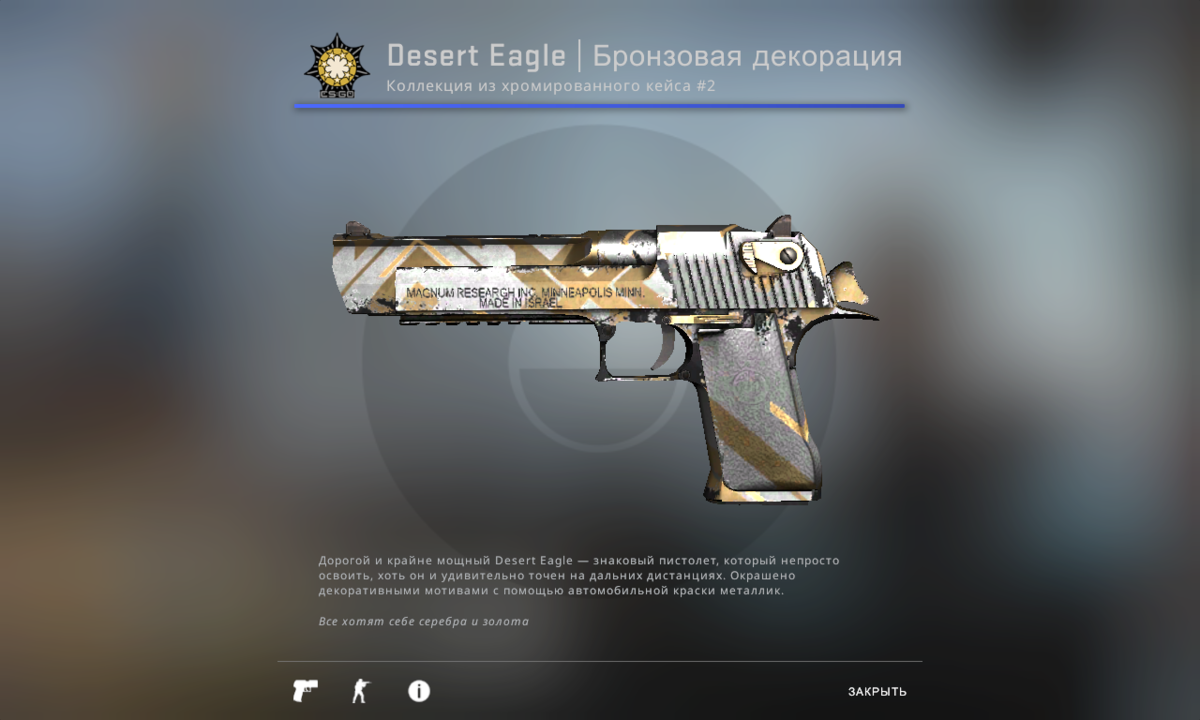 Всем привет, с вами Kilovolt и сегодня я покажу красивые скины на Desert Eagle до 2000 рублей, а в конце вы увидите очень дорогие скины. 1. Desert Eagle | Бронзовая декорация Открывает нашу подборку Desert Eagle | Бронзовая декорация. Качество- после полевых испытаний. Цена начинается от 17 рублей. Окрашен декоративными мотивами с помощью автомобильной краски металлик. Выпадает из "Хромированного кейса№2". 2. Desert Eagle | Оксидное пламя Хороший скин. Качество- немного поношенный. Цена начинается от 26 рублей. Корпус покрыт основой цвета ржавчины, на которую нанесён белый узор. Выпадает из кейса "Спектр". 3. Desert Eagle | Синяя фанера Ни разу не встречал такой скин в игре. Качество- после полевых испытаний. Цена начинается от 22 рублей. Ламинированный корпус с пепельной рукоятью и синим затвором. Выпадает из кейса "Призма 2". 4. Desert Eagle | Директива Необычный скин. Качество- после полевых испытаний. Цена начинается от 35 рублей. Это оружие поможет защитникам будущего уберечь нас