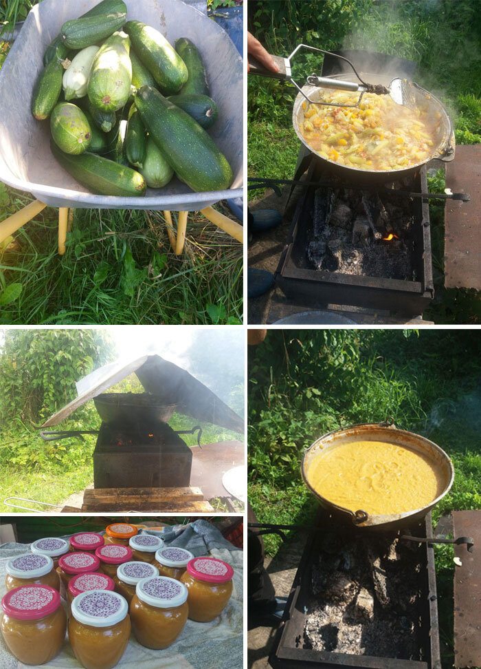 В этом году уродилось очень много кабачков. Традиционные заготовки из них уже успели приесться, захотелось нам попробовать чего-то новенького. Как раз у нас и казан был куплен, поэтому решили приготовить кабачковую икру на костре, чтобы она приобрела пикантный аромат «дымка». Сказано – сделано.
