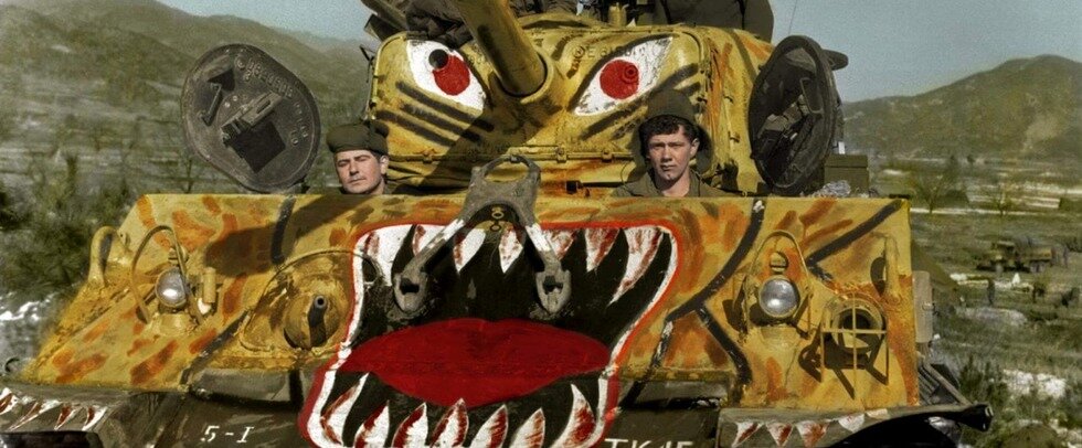 Обычно танки, как и практически любую военную технику, окрашивают в защитные цвета, наиболее характерные для местности, в которой их собираются применять. Покровительственная окраска, подсмотренная, как и многие изобретения, человеком у животных, позволяет уменьшить заметность боевых машин. Снижение контрастности танка на окружающем фоне и нанесение специального искажающего контуры камуфляжа позволяет ввести противника в заблуждение и, затрудняя прицеливание противнику, увеличивает шансы танкистов уцелеть во время боя. Впрочем, у этого правила, как и у почти любого другого, есть исключения. Одним из примеров отказа от использования на танках исключительно камуфлирующей окраски может служить война в Корее 1950 — 1953 годов. В ее ходе американские танкисты часто изображали на танках оскаленные тигриные морды (Tiger face), которые должны были вселить ужас в северокорейских и китайских солдат. Подобная практика была распространена достаточно широко. Клыкастые пасти и гневно смотрящие гла