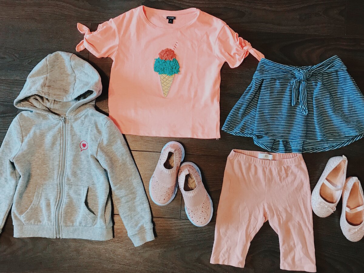 Собрала несколько комплектов для младшей дочки: футболки, шорты, юбки, Сандали.