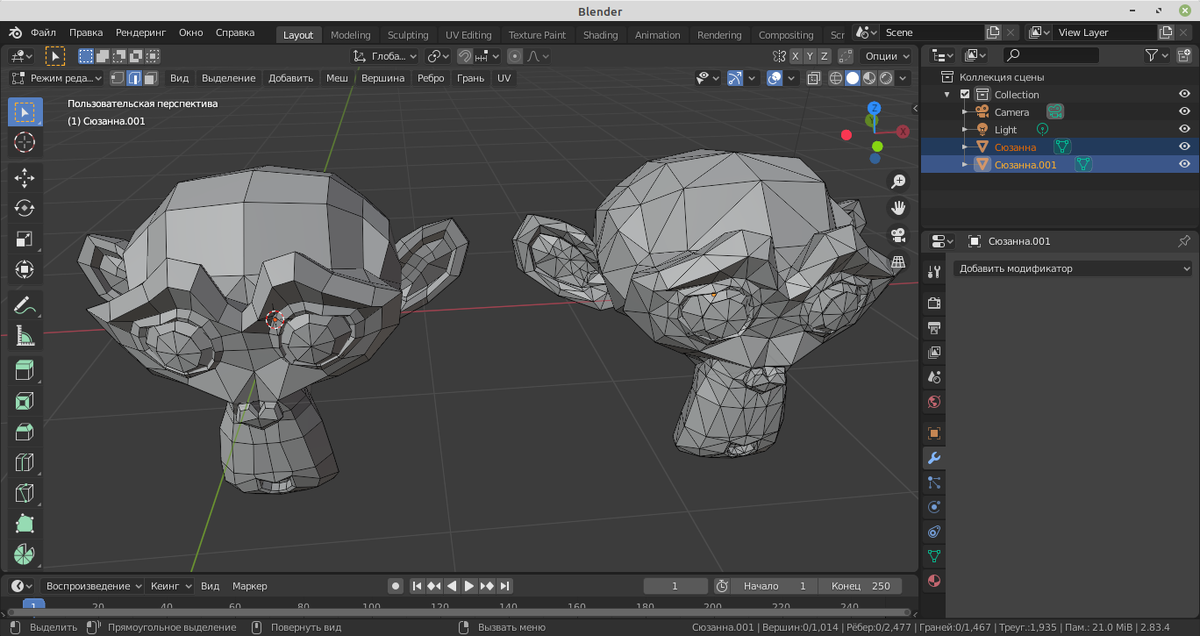 Модификатор Триангуляции преобразует все грани в полисетки (будь то четырехугольники или N-гоны) в треугольные грани. Этот модификатор выполняет такую же функцию, как и преобразовать грани в треугольник (Ctrl-T) в режиме правки. Опции Для четырехугольников Оптимально. Разделяет четырехугольники для оптимальных треугольников, более медленный метод. Фикс. Разделяет четырехугольники через 1-ой и 3-ей вершинами. Альтернативно фиксировано. Разделяет прямоугольники на 2-й и 4-й вершинами. Кратчайшая диагональ. Разделяет прямоугольники в зависимости от расстояния между вершинами. Сохранять нормали. Попытаться сохранить нормали так как они были в четырёхугольниках. Метод для N-угольников Оптимально. Организовывает новые треугольники равномерно, медленный способ. Обрезать. Разделяет N-угольник используя алгоритм отделения обрезков. Минимум вершин. Триангулировать только N-угольники с количеством вершин более или равным указанному.