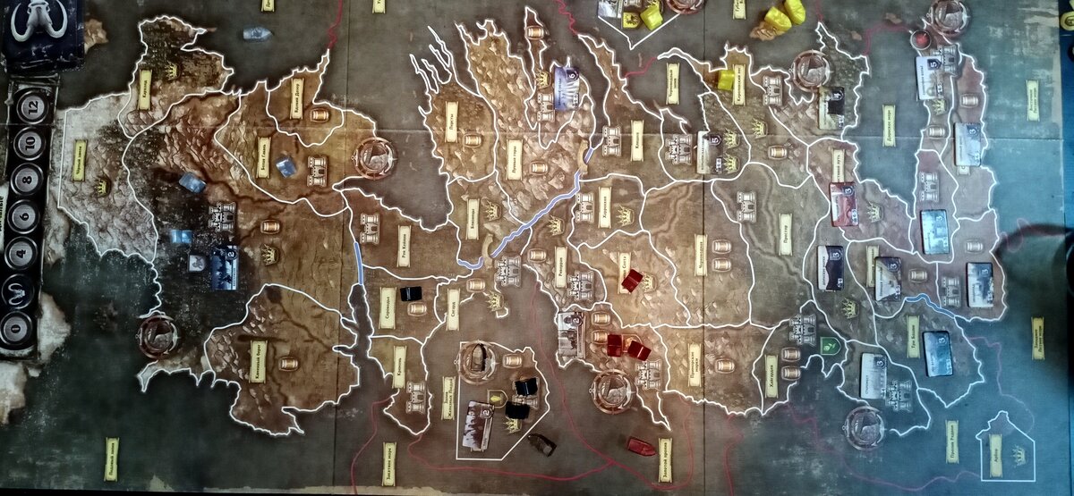 Я резко перескочил несколько раундов, т.к. в них не было ничего интересного: Старки, Грейджои и Ланнистеры, направив пушки друг на друга, велели визави отвалить прочь от их границ. Либо же дать расписку гарантию, что, если они сосредоточат огонь на Баратеонах (которые почти спокойно продолжали захват замков), то Грейджои не ударят в тыл обоим. Железнорожденные убедили прочих королей в искренности своих намерений и даже обещали оказать поддержку в войне против Станниса (все трое, тем не менее, границы-то усилили за пару раундов). Грейджои, усилив границы, отправились на восток, захватив попутно Сероводье, Близнецы и Лунные горы. Ланнистеры отстроили часть флота, укрепив Золотой пролив и, видя, что Железнорождённые не спешат нападать, начали захват южных земель: Харренхол, Хайгадрен и Приморские марки.