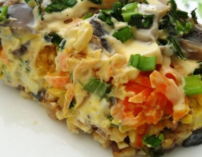 5. Салат можно выкладывать слоями или смешать все в салатнике. Заправить смесью майонеза с горчицей, посолить. Салат «Президент» Ингредиенты: 200-300 гр. копченого куриного филе