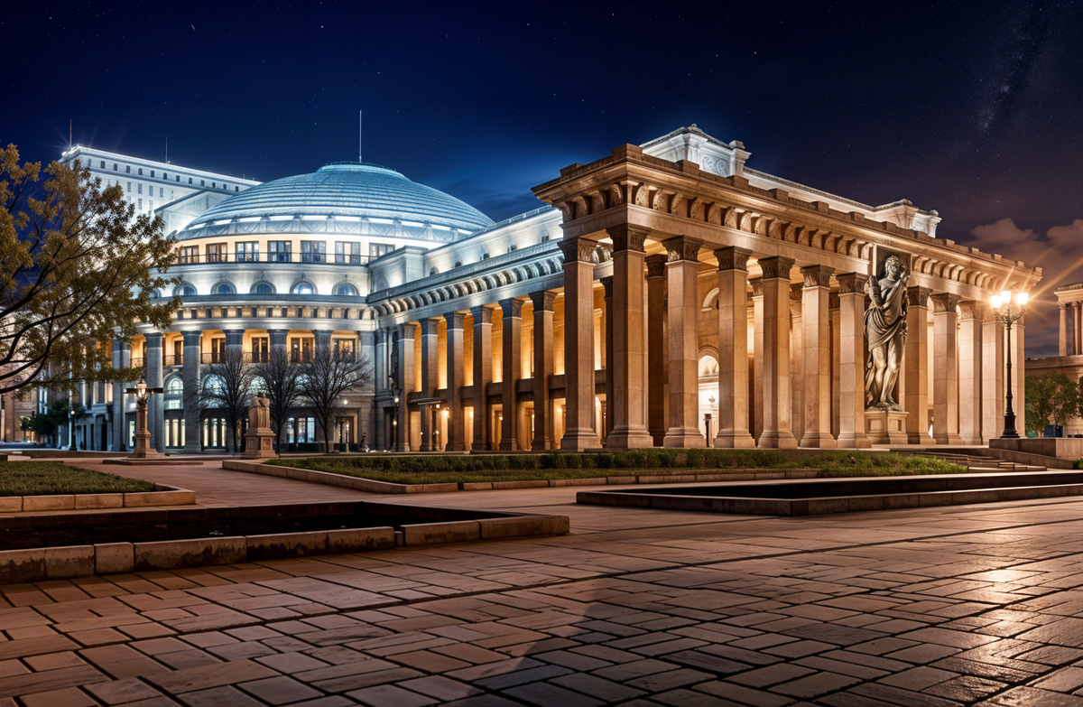 Здание театра, шедевр советской архитектуры, который возводился 14 лет, стал визитной карточкой города. Огромное театральное сооружение стало абсолютным must-to-go приезжих, с удовольствием делающих фотографии на его фоне. Первая постановка прошла здесь 12 мая 1945 года. Современный репертуар театра представлен классическими произведениями, новаторскими постановками, детскими спектаклями и концертными программами.