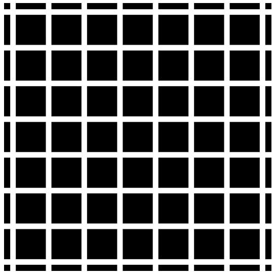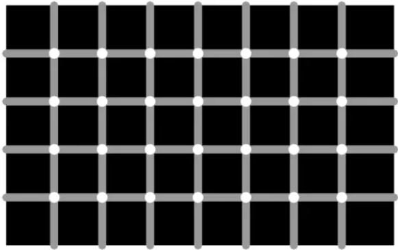 Эта иллюзия показывает 12 черных точек на серо-белой сетке. Тем не менее, невозможно увидеть все 12 точек сразу. Если бы на изображении не было серо-белой сетки, люди могли бы видеть все 12 точек. Французский ученый и специалист по зрительному восприятию Жак Ниньо создал эту иллюзию в 2000 году и опубликовал подробное исследование, объясняющее, как она обманывает разум.