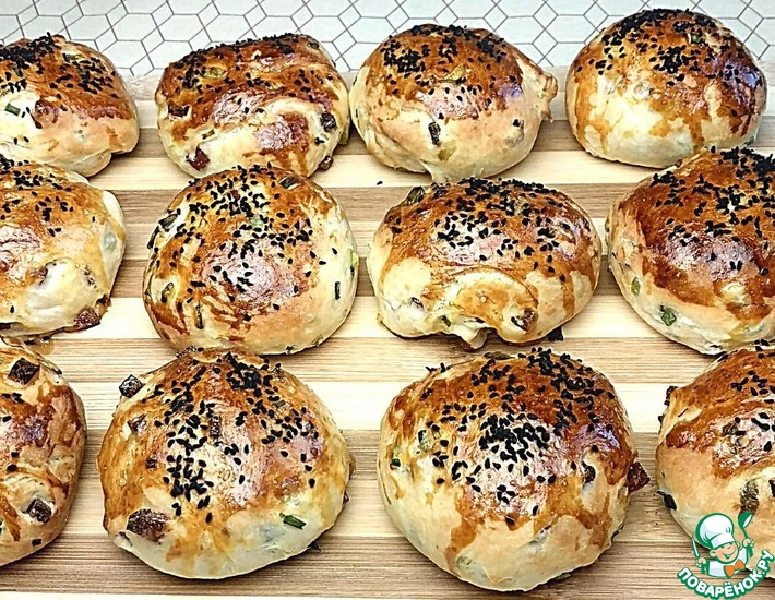 Предлагаю рецепт сдобных булочек на дрожжевом тесте с копчёной колбаской и зелёным луком. Ингредиенты для «Пышные булочки с копченой колбасой и зеленым луком»: Время приготовления: 150 минут Количество порций: 12 Пищевая и энергетическая ценность: Готового блюдаккал