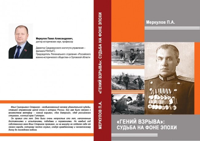18 августа в Среднерусском институте управления – филиале РАНХИГС вышла научная монография доктора исторических наук, профессора Павла Меркулова «ГЕНИЙ ВЗРЫВА»: СУДЬБА НА ФОНЕ ЭПОХИ о жизни и боевому пути уроженца Болховского района Ильи Григорьевича Старинова. Илья Григорьевич Старинов – необыкновенный человек удивительной судьбы, ставшей отражением целой эпохи в истории России. Его имя было связано с множеством метафор – «гений взрыва», «бог диверсий», «дед российского спецназа», «личный враг Гитлера». И все эти образные «имена» были даны ему современниками не для красного словца, ибо полковник Старинов еще при жизни стал легендой. Герой этой книги водил поезда и пускал их под откос, строил железные дороги и защитил диссертацию о способах их разрушения. Он ходил в тыл противника в качестве диверсанта и сам обезвреживал вражеских лазутчиков. Полковник Старинов не только устанавливал имевшиеся на вооружении отечественные мины, но и изобретал новые, ставшие широкоизвестным и во многих