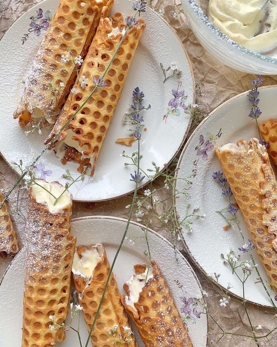 Вафельные трубочки Ингредиенты: ▫️ яйца куриные — 2 шт. ▫️ сахар тростниковый — 50 г ▫️ сливочное масло — 100 г ▫️ пшеничная мука — 90 г ▫️ разрыхлитель — ½ ч. л. ▫️ ванилин — ½ ч. л. ▫️ соль — 1 щепотка Масляный крем: ▫️ молоко сгущенное — 380 г ▫️ сливочное масло — 180 г Способ приготовления: 1. Яйца взбейте со щепоткой соли. 2. Добавьте тростниковый сахар и снова хорошо взбейте (венчиком или миксером). 3. Влейте растопленное сливочное масло и хорошо перемешайте. 4. В отдельной посуде смешайте пшеничную муку (просейте), разрыхлитель и ванилин. Всыпьте к яичной массе и хорошо смешайте венчиком. 5. Вафельницу хорошо разогрейте (примерно 2 минуты), кисточкой смажьте поверхность растительным маслом (смазывайте перед выпеканием каждой трубочки) и выложите одну столовую ложку теста. Вафельницу закройте и выпекайте вафлю около 30 секунд, а затем быстро сверните в трубочку. 6. Приготовьте крем. Мягкое сливочное масло (достаньте из холодильника за 30 минут) взбейте миксером (около 1 минуты)