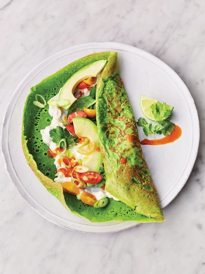"Красочные, здоровые и, самое главное, веселые, эти блины работают так же хорошо на ужин, как и на поздний завтрак в выходные дни. Оставьте любое оставшееся тесто в закрытой миске в холодильнике, и они будут держать его для завтрака позже на этой неделе. И проявите творческий подход к своим начинкам – небо-это предел. Наслаждайтесь! ” Рецепт Ингредиенты