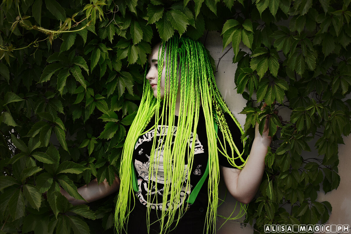 С местом фотосессии я определилась быстро – лианы вьюна на ограде какого-то завода. Очень странно, что они там растут. Но они невероятно красивые. Каждый раз, когда я проезжала мимо на автобусе, вьюны привлекали моё внимание. Неоново-зеленые афрокосы и вьюны – показались мне идеальным сочетанием. И даже не смотря на то, что день был жаркий, мы отправились на фотосессию, воплощать мою идею в жизнь.