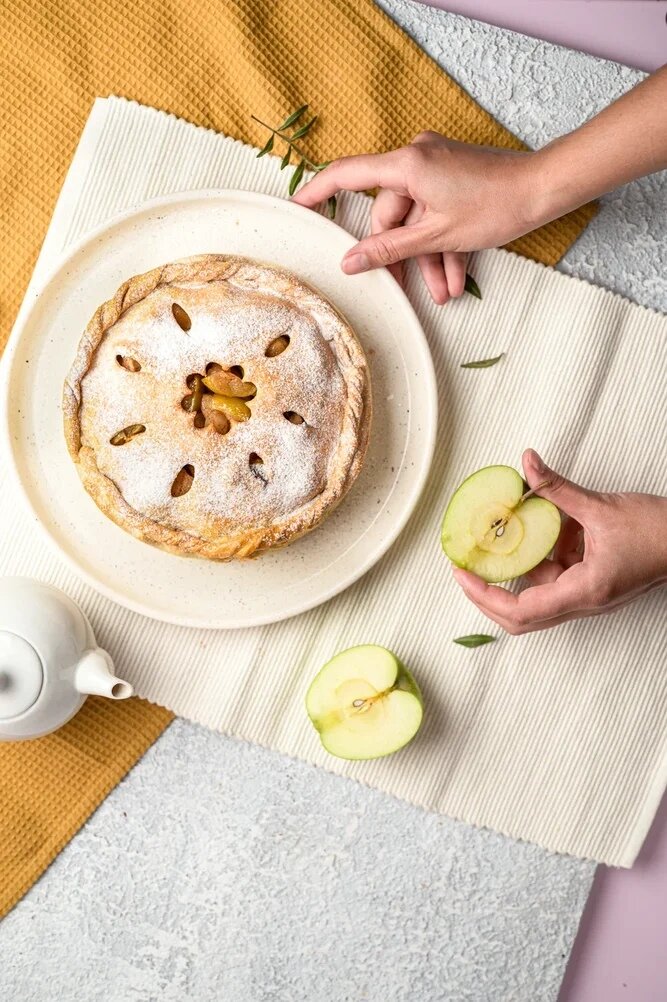 Тонкое, хрустящее тесто со множеством крошек и тягучая, сочная начинка из кисло-сладких сахарных яблок с корицей.