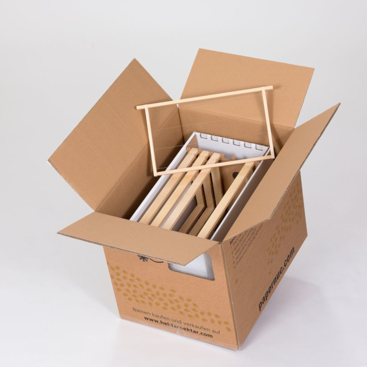 Упаковка для перевозки пчел изготовлена из гофрокартона и состоит из двух частей – внешней и внутренней. Внешняя транспортная коробка имеет простую четырехклапанную конструкцию. Внутренняя часть упаковки представляет из себя коробку, снабженную сложной конструкцией для крепления шести рамок с сотами. Благодаря воздушной подушке между ящиками температура внутри остается стабильной, и пчелы могут свободно перемещаться.