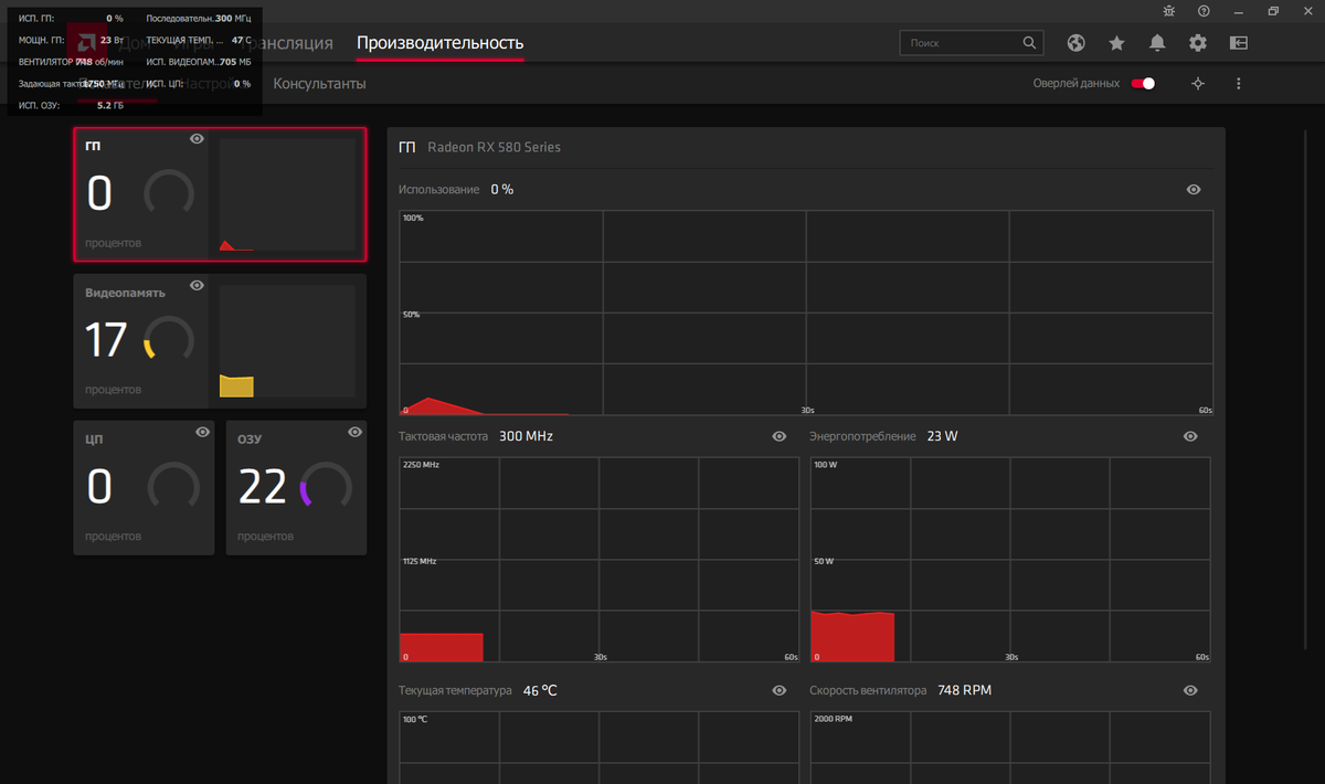 Так как я за красных, иду во вкладку "Производительность" и двигаю ползунок "Оверлей данных" в право. Окошко с показателями появилось, и отображается поверх всех окон. Чтобы настроить нужные нам выводимые данные, можно поковыряться в настройках вкладки "Производительность".