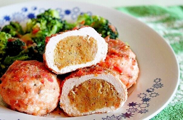 Куриные шарики Итого на 100 грамм 51 ккал Б/Ж/У 7.7 / 0.6 / 3.8 На 6 шариков: Ингредиенты: куриная грудка 200 г, белок 1 шт, фасоль/чечевица 50 г (в сухом виде), морковь 30 г, лук репчатый 30 г, 2-3 зубчика чеснока, специи (розмарин, орегано, кориандр, смесь перцев), помидоры 2 шт, вода 150-200 мл. Приготовление: 1. Фасоль/чечевицу предварительно отварить. Морковь и лук порезать, обжарить на сковородке без масла. Отварную фасоль/чечевицу, обжаренные морковь и лук, специи (кориандр, орегано и смесь перцев) измельчить блендером (если будет очень сухо можно добавить 2-3 ст.л. воды). 2. Приготовить фарш из куриной грудки – измельчить ее в блендере/пропустить через мясорубку, добавить яичный белок, выдавить пару зубчиков чеснока, - перемешать. 3. Разделить фарш на 6 равных частей. Из каждой части вылепить лепешку (что бы фарш не прилипал можно смочить руки холодной водой), в центр лепешки выложить начинку из фасоли/чечевицы, сформировать шарик. 4. Выложить шарики в не