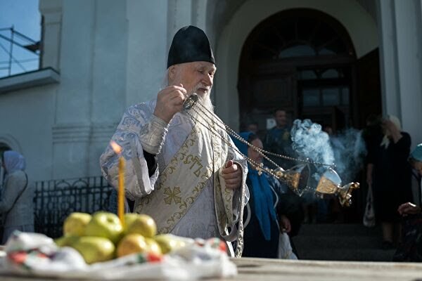 А после литургии священник читает специальную молитву на освящение плодов нового урожая. А затем он их окропляет святой водой.