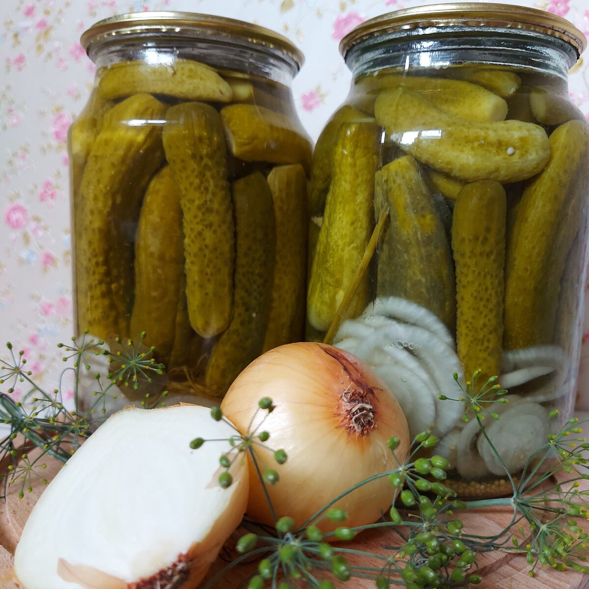 Хочу поделиться рецептом самых вкусных маринованных огурцов, которые я когда-либо ела. Даже мой муж полюбил их, хотя до того, как их попробовал, признавал только кислые соленые. Поделилась со мной этим рецептом моя дорогая подруга Оля, поэтому мы так и называем огурцы - "Олюшкины". Рецепт пишу на 1л банку. В банку закладываем небольшой листик хрена, зонтик укропа, 9-10 горошин перца, 5-6 палочек гвоздики, 1-2 шт. лаврового листа, 2 ч.л.(без горки) семян горчицы, несколько колечек лука (можно и больше, потому что он получается тоже очень вкусный). Укладываем огурцы и сверху насыпаем 3 ч.л.ложки соли и 6 ч.л.сахара (можно сразу растворить в небольшом количестве холодной воды и вылить в банку). Залить холодной водой. Подготовленные банки с огурцами накрываем металлическими крышками, ставим в кастрюлю, наливаем холодную воду и после закипания стерилизуем 10 минут. Затем в банку добавляем 1,5 ч.л. 70° уксуса, закатываем крышкой, переворачиваем вверх дном и закутываем. При добавлении без