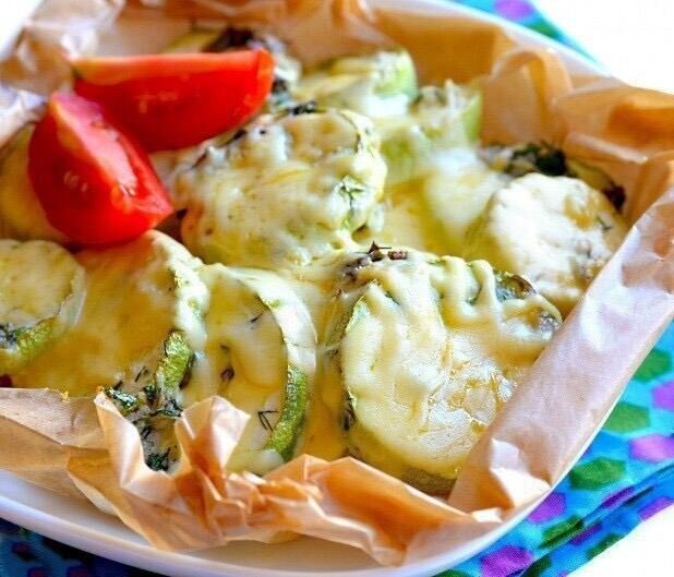 Кабачки с чесноком в духовке Итого на 100 грамм 73 ккал Б/Ж/У 7.6 / 2.13 / 3.4 Ингредиенты: Кабачок – 200 г Чеснок – 3 зуб. Сыр – 80 г Укроп – 2 вет. Петрушка – 2 вет. Перец чёрный молотый – по вкусу Соль – по вкусу Приготовление: Кабачок помыть, нарезать дисками. Сложить в миску. Добавить мелко нарезанные укроп и петрушку. Добавить выдавленный через пресс чеснок, посолить и поперчить по вкусу. Перемешать всё руками, чтобы чесночная масса равномерно распределилась по кабачкам. Выложить кабачки в форму или, как мы предлагаем, порциями на пекарской бумаге. Запекать в разогретой до 220 градусов духовке 25 минут. Вынуть из духовки и посыпать натёртым сыром. Запекать ещё 5 минут и украсить помидорками. Блюдо подать горячим как основное или как гарнир к мясу. Приятного аппетита!