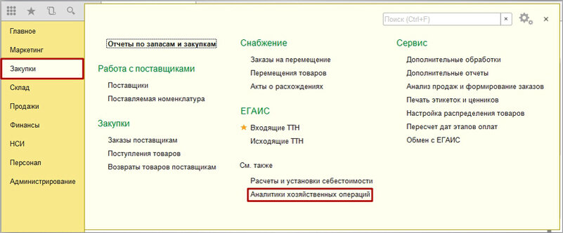 Возврат алкогольной продукции поставщику на основании поступления формируется точно также, как и для любых других товаров. Для начала, заходим в раздел Закупки, откроем Аналитики хозяйственных операций. И Создаём новую аналитику. Выбираем операцию Возврат поставщику, вводим аналогичное название и нажимаем Записать и закрыть. После создания хозяйственной аналитики для возврата товара поставщику, находим ранее оформленный документ поступления возвратной номенклатуры. Для этого, заходим в раздел НСИ и открываем Номенклатура. Находим вручную или же сканируем штрихкод для поиска возвратной номенклатуры, нажимаем пиктограмму с изображением документов и выбираем Анализ Движений . В документе с анализом движений мы указываем нужный период, выбираем магазин, нажмём Сформировать и открываем нужный документ поступления номенклатуры. Теперь, приступаем к непосредственному оформлению возврата товара из документа поступления. Нажмём пиктограмму с зеленой стрелкой и выбираем Возврат товаров поставщ