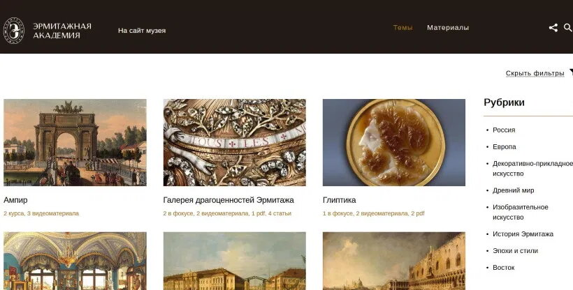 У Государственного Эрмитажа есть собственный образовательный онлайн-проект «Эрмитажная академия». В коротких видеолекциях научные сотрудники Эрмитажа рассказывают о художественных направлениях и исторических периодах в искусстве, произведениях из фондов музея, реставрационных работах, эрмитажных коллекциях. Тут же, разумеется, можно посмотреть и сами картины. Ко многим темам прилагаются дополнительные маетриалы – брошюры в формате pdf и статьи. Все материалы разделены на рубрики: Темы: Ампир (2 курса, 3 видеоматериала) Галерея драгоценностей Эрмитажа (2 в фокусе, 2 видеоматериала, 1 pdf, 4 статьи) Глиптика (1 в фокусе, 2 видеоматериала, 2 pdf) Жилые покои главной императорской резиденции (7 видеоматериалов) Зимняя императорская резиденция Петра I (2 видеоматериала, 1 pdf) Искусство Италии (2 курса, 6 видеоматериалов, 5 pdf, 1 статья) Искусство стеклоделия (2 курса, 1 в фокусе, 3 видеоматериала, 3 pdf) Искусство Фландрии (2 курса, 5 видеоматериалов) Искусство Франции второй половины XIX
