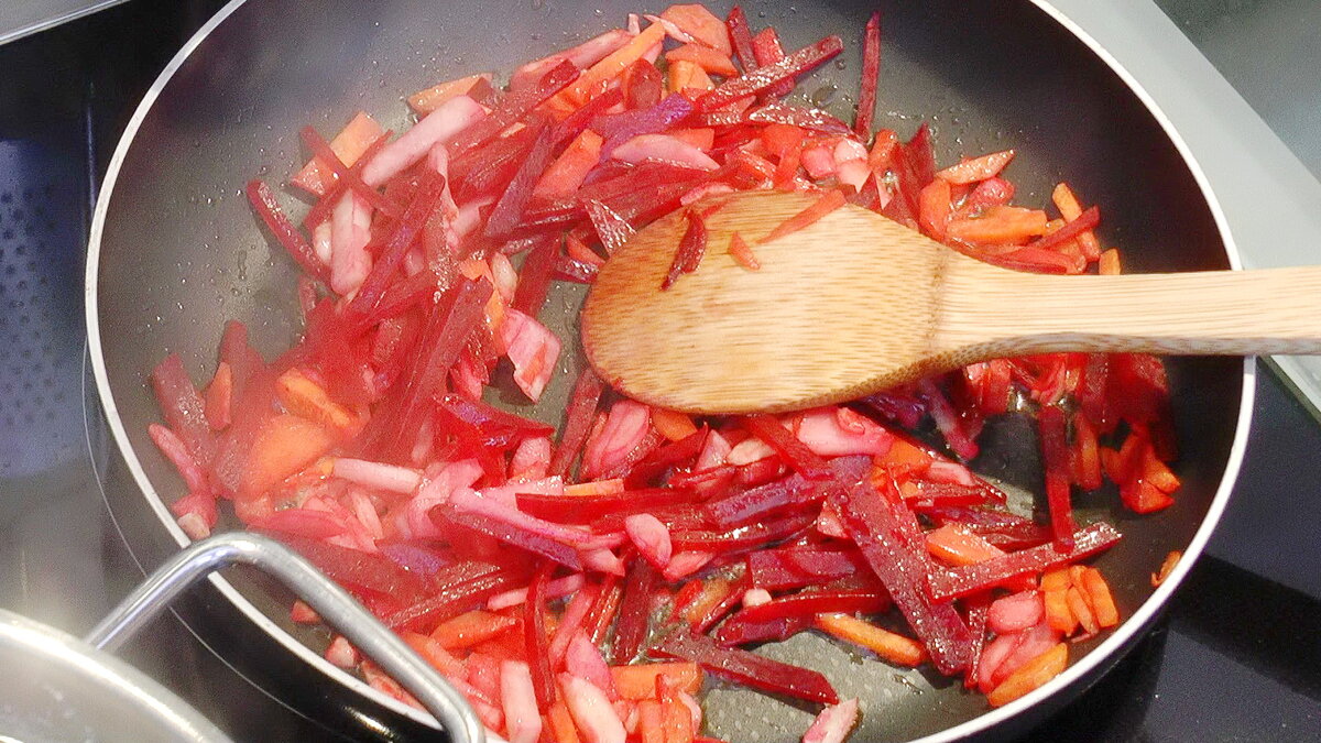 1. Свёклу, корень петрушки и морковь нарезать тонкой соломкой и пассеровать в сковороде на растительном масле.