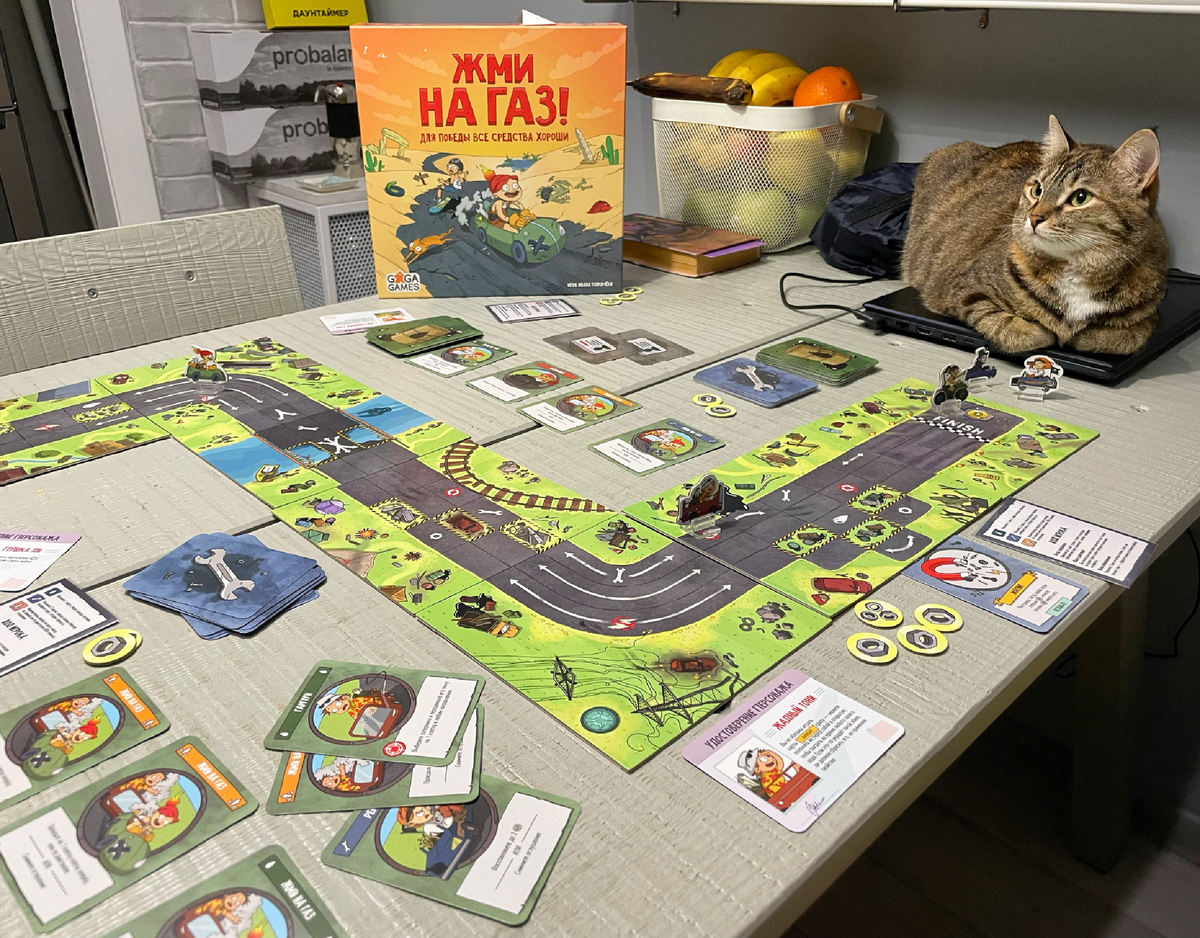 Не так давно я получила на пробу сигналку игры «Жми на газ». Игры-гонки я люблю, опыт в них достаточный, «реализм» движения по трассе меня более чем привлекает, поэтому мы решили сыграть уже следующим вечером — чтобы по возможности дальше отправить сигналку на обзоры. Мы сели втроём — я сразу заподозрила, что Кире зайдёт рисовка, немного отдающая «Гравити Фолз», и сам смысл игры — пакости на дороге. Ну и не ошиблась:) Игра довольно пакостная даже втроём — это не только гонка в привычном понимании, но и обоюдное вредительство. Причём это чётко направленный take that, поэтому обидчивым здесь не место, — вплоть до того, что можно уничтожить чужую машину, заставив игрока откатиться на 6 клеток назад, сбросить все накопленные плюшки и карту персонажа. Часть игры совпадает с другими гонками («Формула скорости», «Раллимен»): здесь нужно занимать выгодные клетки на трассе, затыкая другим проезд. Забавное «хорошо забытое старое» нововведение в виде клеток со стрелками, по которым вы перемещаете