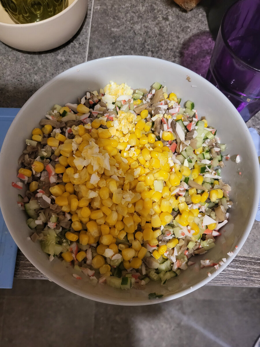 Приехала с работы. У мужа осталось не много еды - буквально пара котлеток из терпуга и рассольника чуть. Не порядок. Поставила жариться заранее замороженные , обвалянные в муке кусочки печени. Жарю я обычно в мультиварке. Режим выпечка, с закрытой крышкой. Масло обычно смесь: подсолнечное и сливочное. Мне кажется жарение получается так вкуснее. Сливочное масло дает приятный, мягкий вкус. Обычно сверху добавляю еще порошок сушеного лука. Запах обалденный и цвет ! Ну а как прихватиться до легкой корочки, то можно и на режим подогрев поставить - пусть томиться, как в русской печи. Салатики я делаю ну не то что бы часто-не часто: под настроение. У меня давно стояла припрятанная банка маринованных резанных шампиньонов. Ну а в последний свой набег на магазин разжилась крабовыми палочками и консервированной кукурузой. В принципе в таком салатике ничего сложного. Мелко порезать крабовые палочки, шампиньоны, свежий огурец и отварное яйцо, ну а потом перемешать с майонезом. А это разные инг