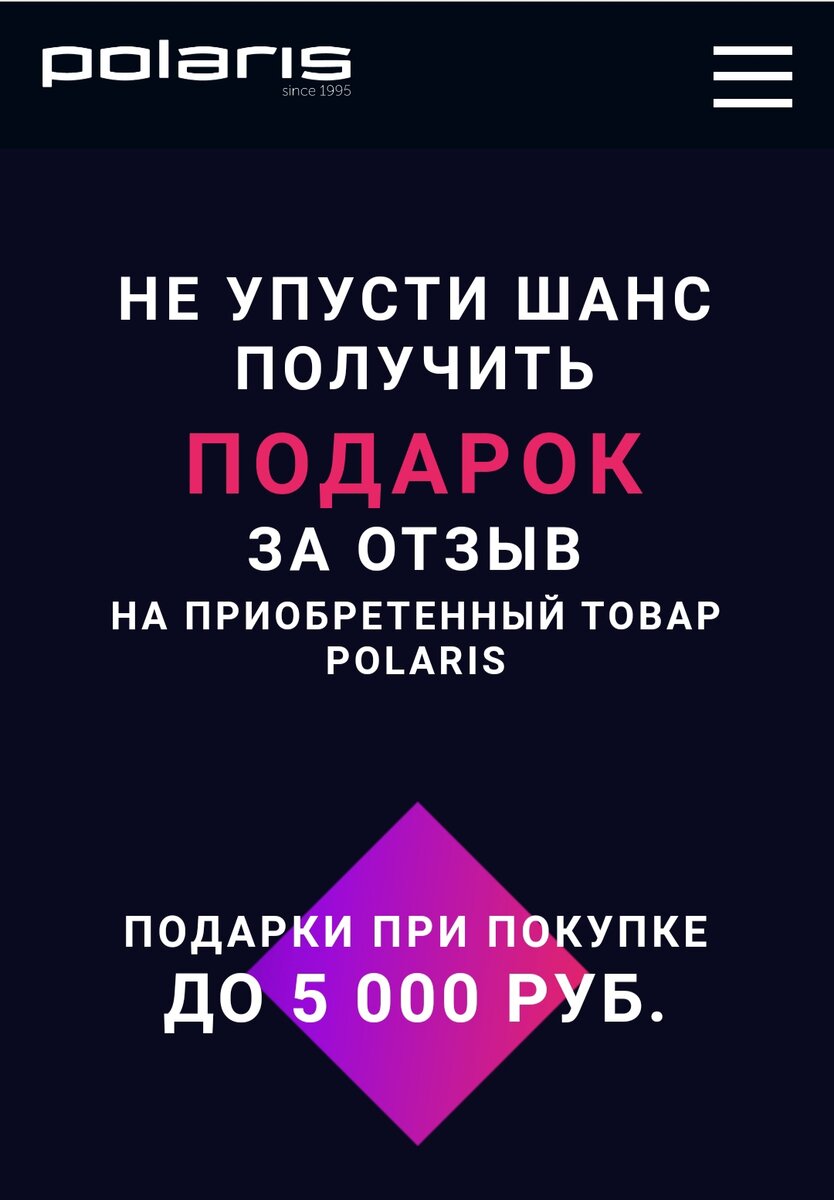 Давненько хотела вам рассказать об одной весьма занимательной акции от бренда Polaris, очень уж радует возможность получить весьма неплохие и при этом гарантированные подарки (в том числе и денежные)! Публикация будет интересна тем, кто только планирует приобретать что-то из техники (и возможно это будет именно Polaris), так и тем, кто уже покупал что-то от этого бренда. Ведь в акции участвуют покупки, совершенные в период с 1 сентября 2020 года по 30 ноября 2023 года.