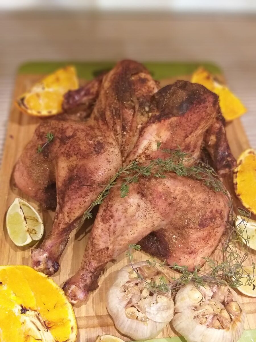 Приготовление: кулинарными ножницами вырезаем хребет, обсушиваем курицу бумажным полотенцем, смешиваем специи и обсыпаем курицу, отправляем курицу часов на шесть в холодильник на верхнюю полку, ничем не закрываем, тогда корочка будет хрустящей и аппетитный.