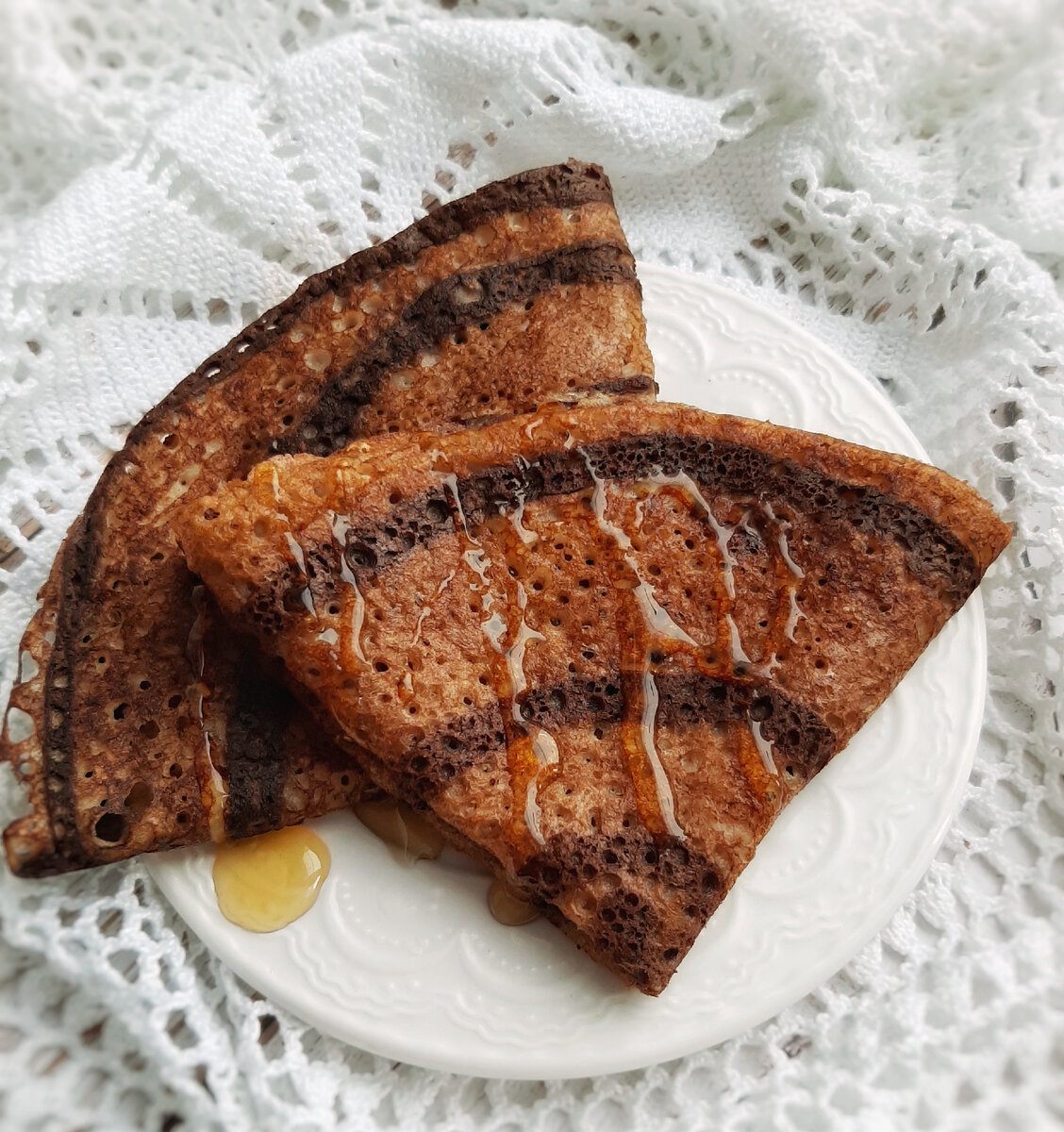 🌞КБЖУ на 100 г.: 192.7 ккал 8/7.6/22.8 Выход: 380 г., 8 шт. 🌞Ингредиенты: Молоко 2.5% - 200 г. Яйцо куриное - 2 шт. Мука Рисовая - 50 г. Мука Цельнозерновая - 50 г. Вода (кипяток) - 200 г. Масло оливковое - 10 г. Кероб или Какао-порошок - 10 г. Разрыхлитель - 5 г. (1 ч.л.) Подсластитель - 6 г. Щепотка соли. 🌞 Приготовление: 1️⃣ В миске смешиваем: два яйца, 200 г. молока, два вида муки по 50 г., чайную ложку разрыхлителя и 6 г. подсластителя. 2️⃣ Вливаем кипяток (200 г.) и перемешиваем. 3️⃣ Добавляем 10 г. масла и снова перемешиваем. 4️⃣ Четверть теста откладываем в другую миску. Добавляем 10 г. кероба или какао и перемешиваем. 5️⃣ Перекладываем шоколадное тесто в любую удобную ёмкость, пакетик или мешочек, у меня одноразовый кондитерский мешок. 6️⃣ Сковороду хорошо разогреваем и рисуем шоколадным тестом узор, любой на свой вкус. Тесто довольно жидкое, поэтому рисовать нужно быстро🙂 7️⃣ Сразу же наливаем белое тесто и размазываем его по сковороде. Сковорода должна быть хорошо нагр