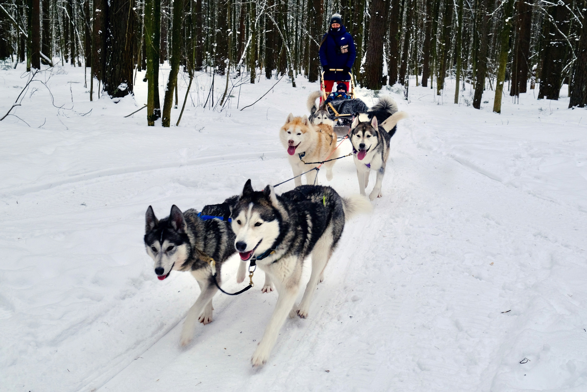 Хаски бегут по лесу в Парголово под управлением Кати. Катя — каюр, она управляет нартами, очень похожими на финские санки. Катя стоит, а пассажир, укрытый одеялами, сидит. Мелькают сосны, блестит снег — кажется, полозья бегут быстрее лани. Подарок родителей мальчику нравится.