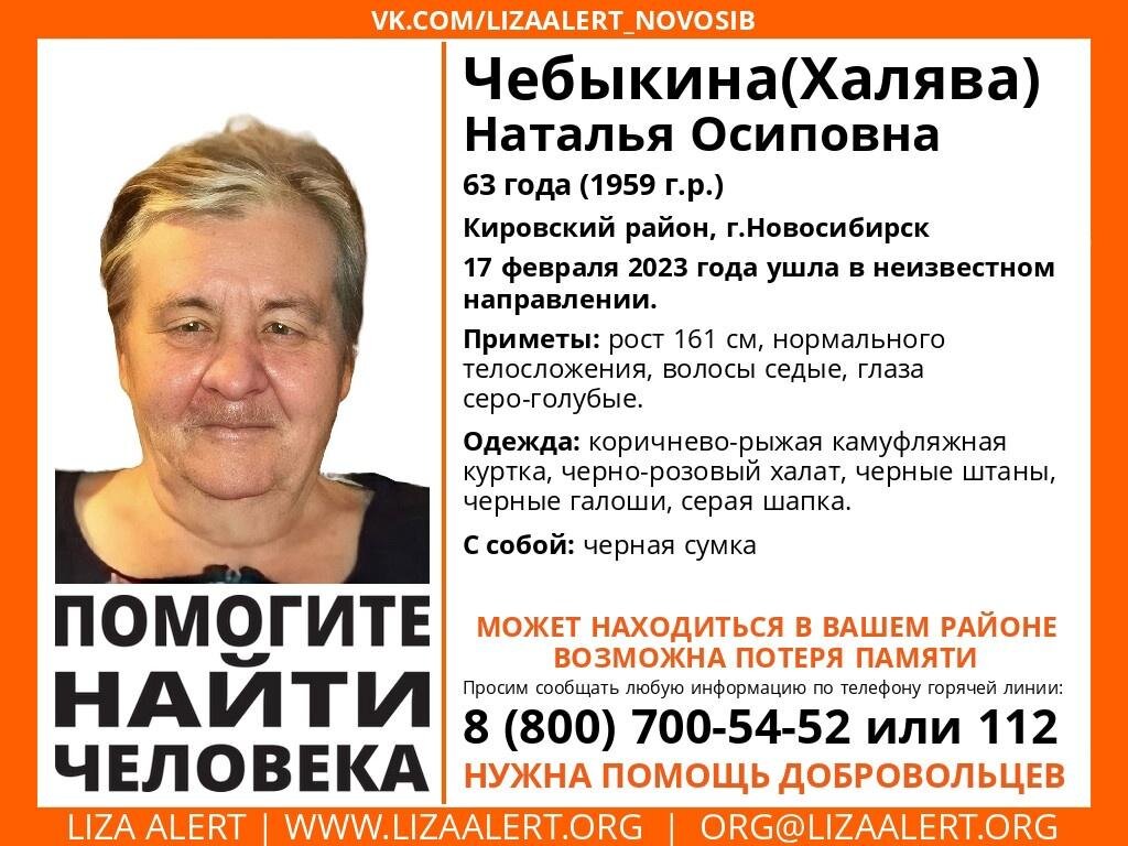 В Новосибирске без вести пропала пожилая женщина. В Новосибирске пропала 63-летняя Наталья Чебыкина (Халява). Как сообщили в поисково-спасательном отряде «Лиза Алерт», женщину последний раз видели сегодня, 17 февраля. Волонтёры объявили срочный сбор добровольцев для выезда на поиски пропавшей без вести. Подробности можно узнать по ссылке. Приметы пропавшей: рост 161 см, нормальное телосложение, седые волосы, серо-голубые глаза. Наталья Чебыкина на момент пропажи была одета в коричнево-рыжую камуфляжную куртку, чёрно-розовый халат, чёрные штаны, галоши и серую шапку. С собой у женщины была чёрная сумка. Волонтёры предупредили, что женщина может находиться в любом районе и страдает потерей памяти. Напомним, ранее в Новосибирске были прекращены поиски 23-летней девушки, пропавшей в День влюбленных. UPD: Наталья Чебыкина найдена живой, сообщили вечером 17 февраля волонтёры.